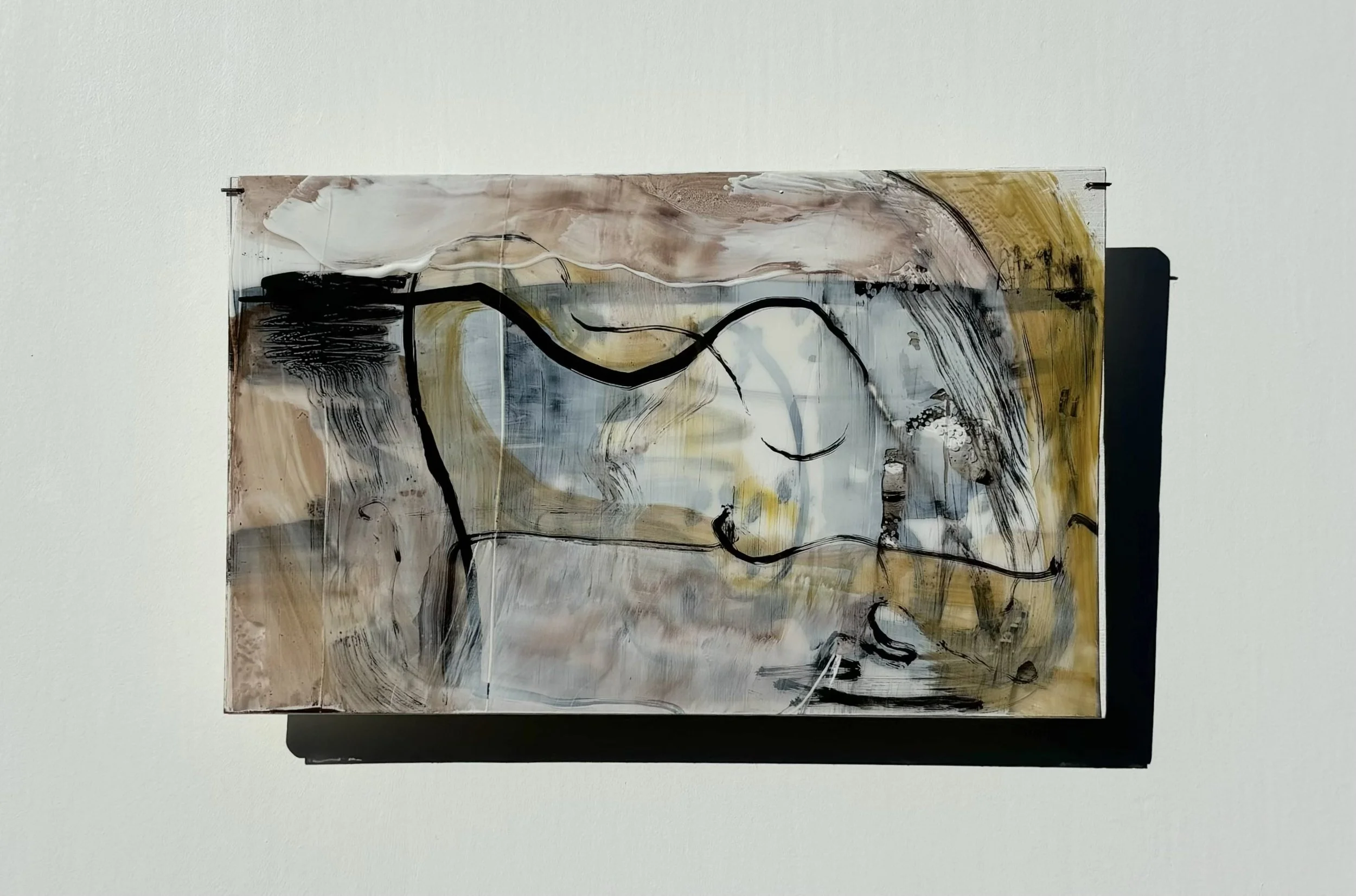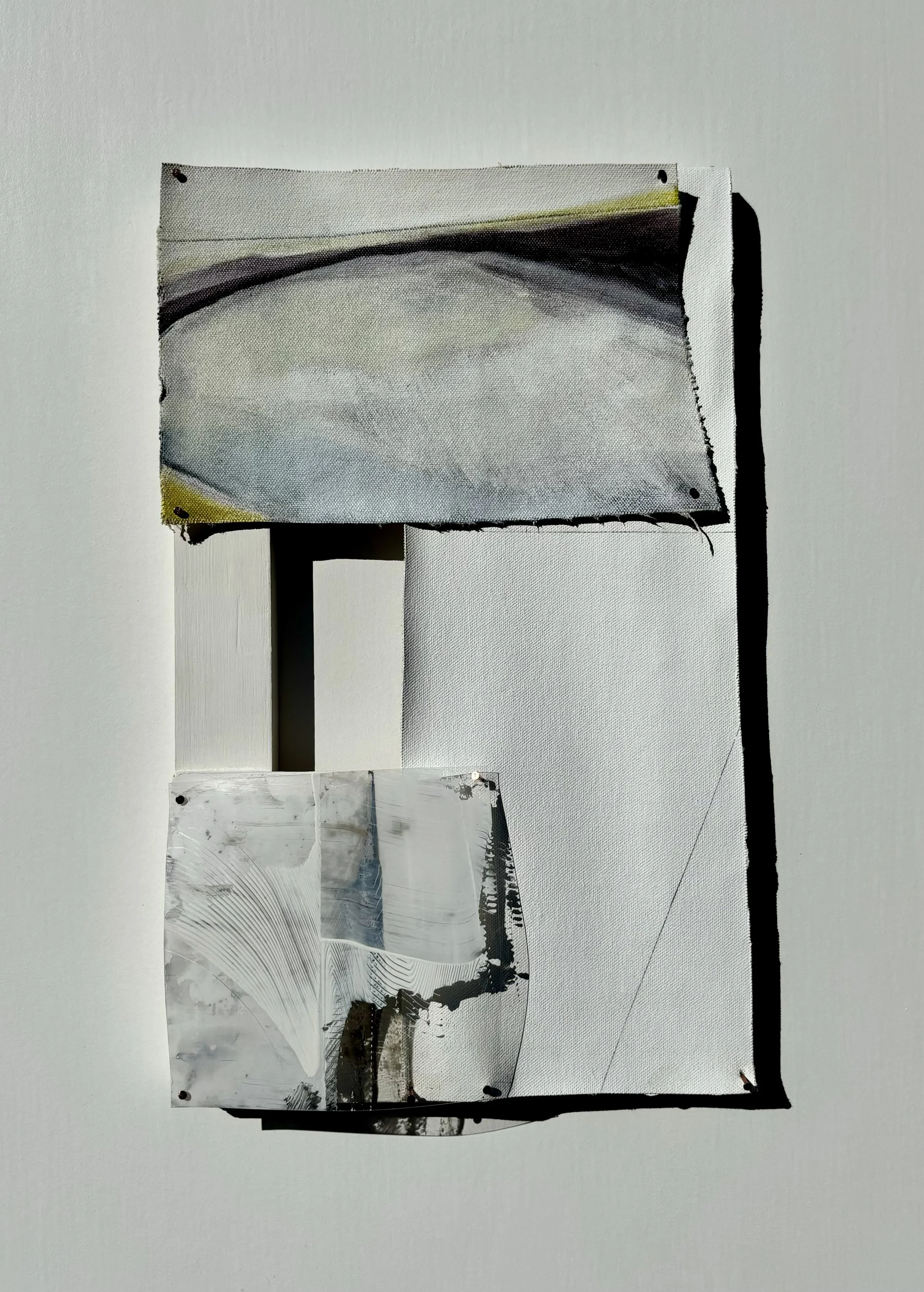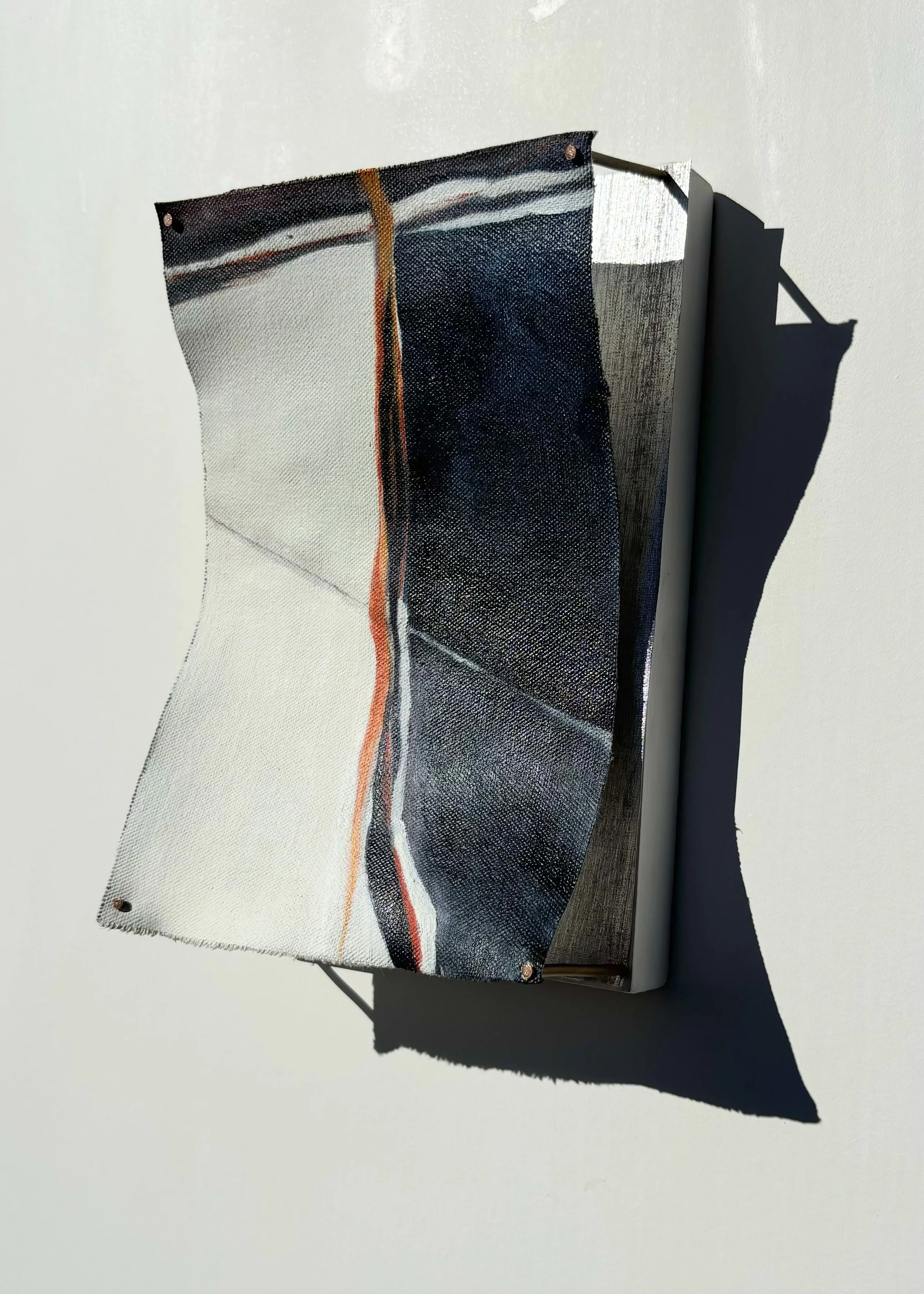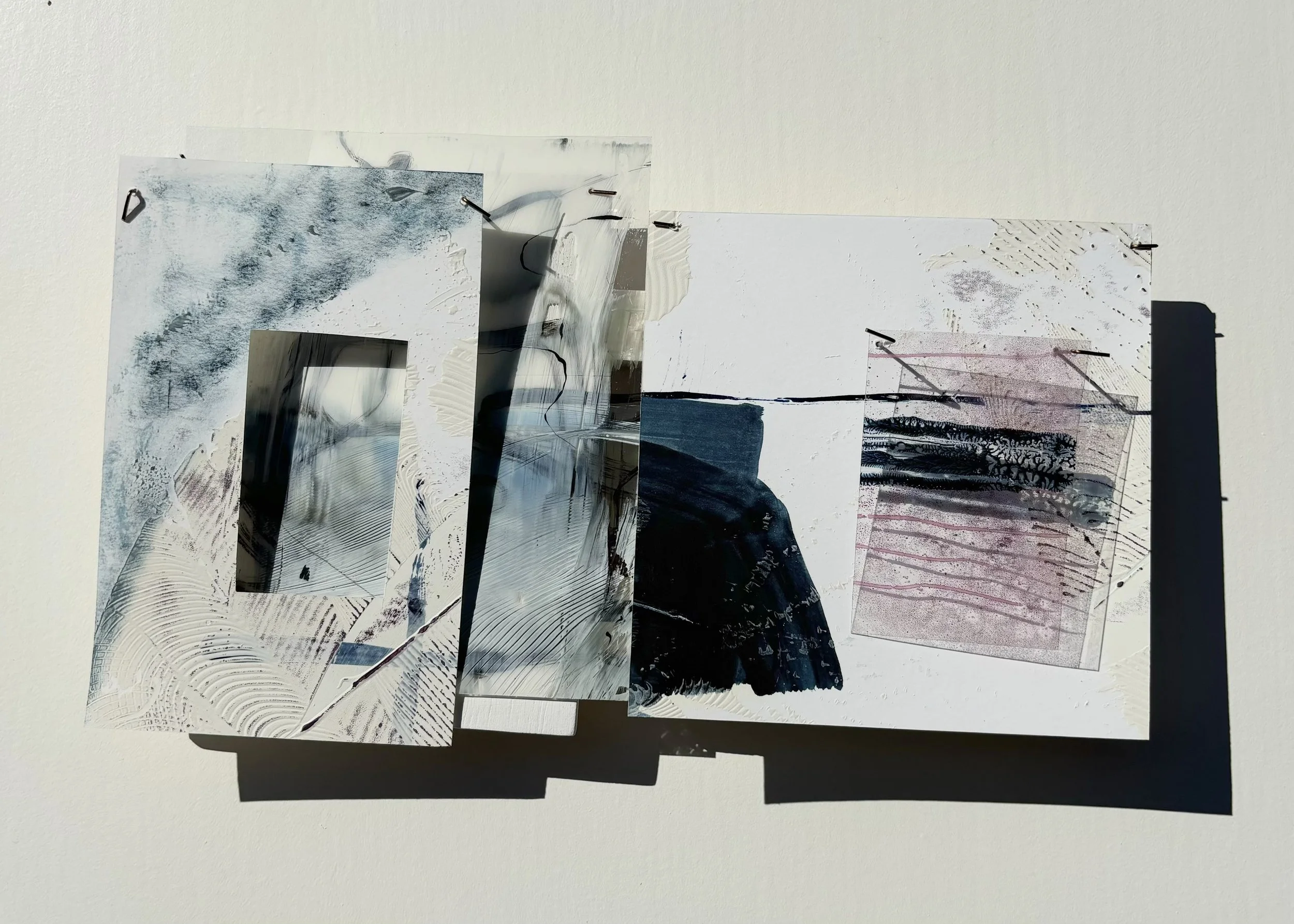 I use oil paint and printmaking techniques to develop dimensional, interlacing landscapes and charts. They reach out into space–using multiple surfaces to capture a path across the planet.