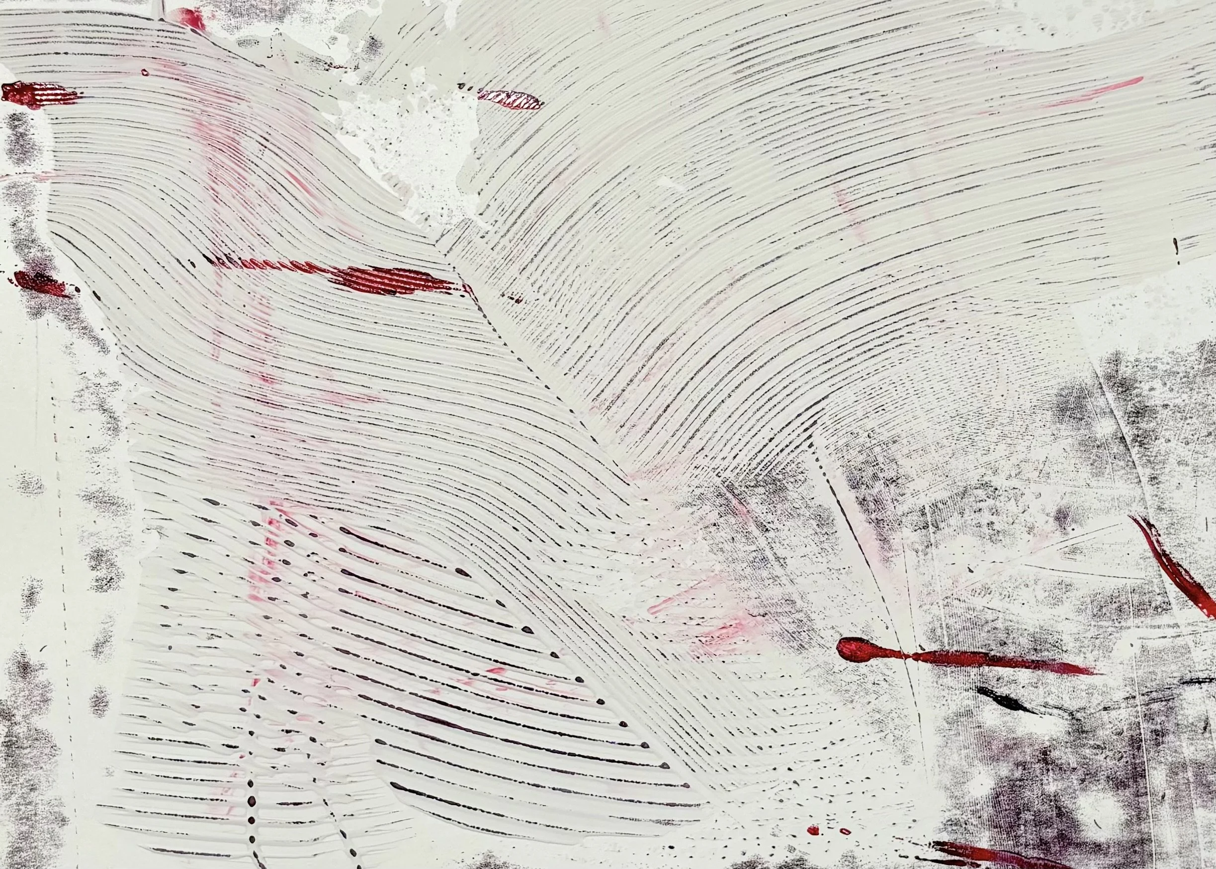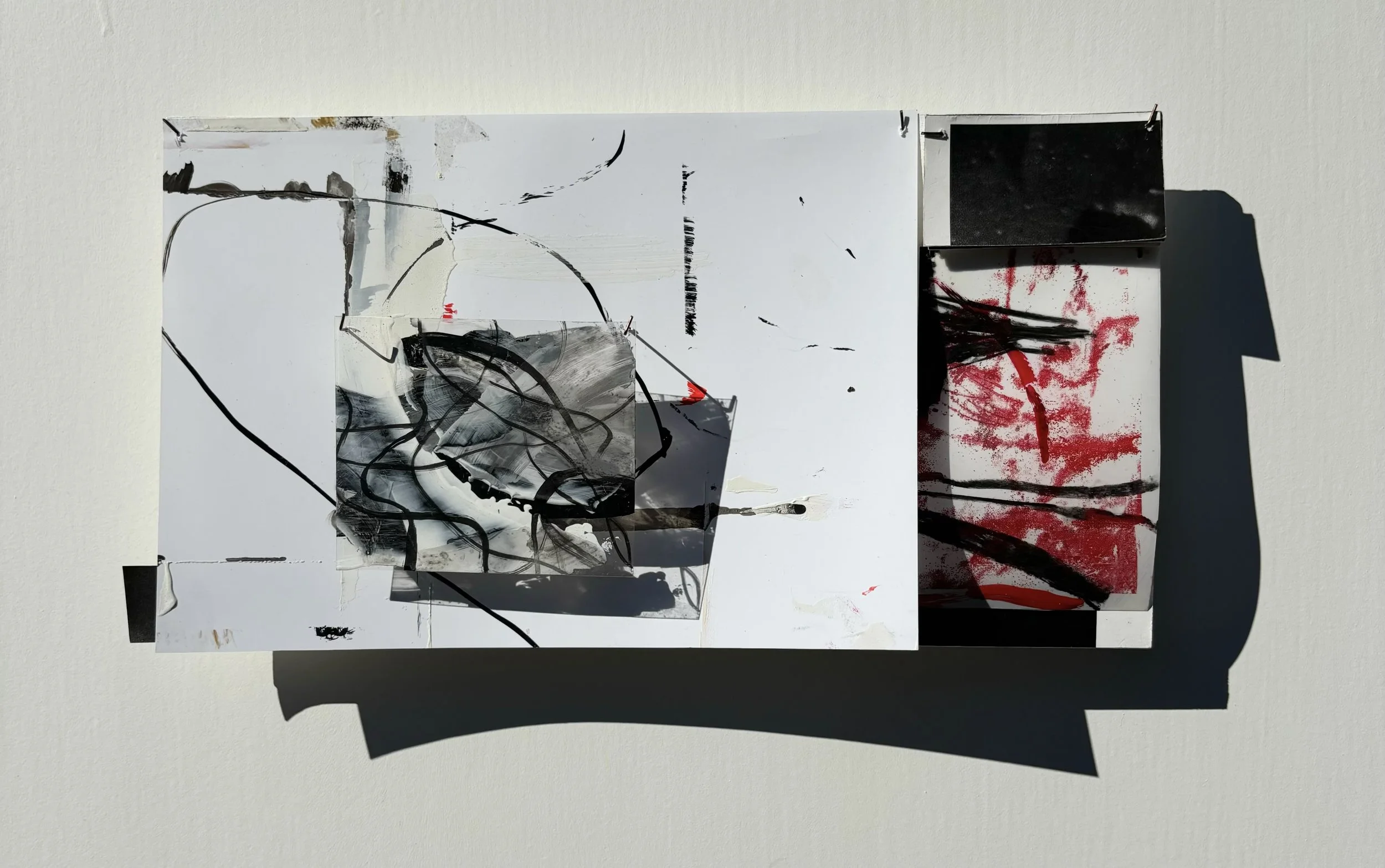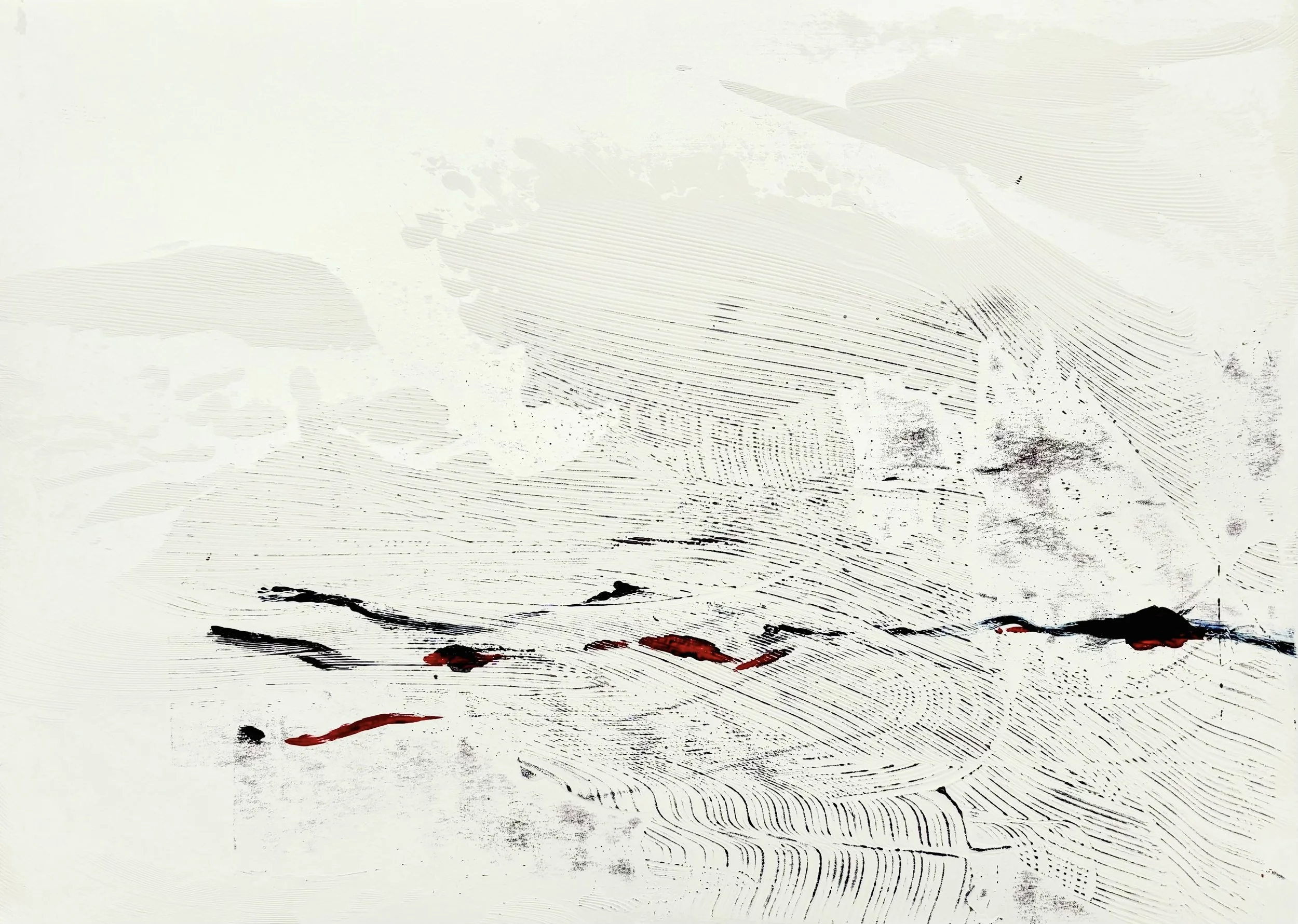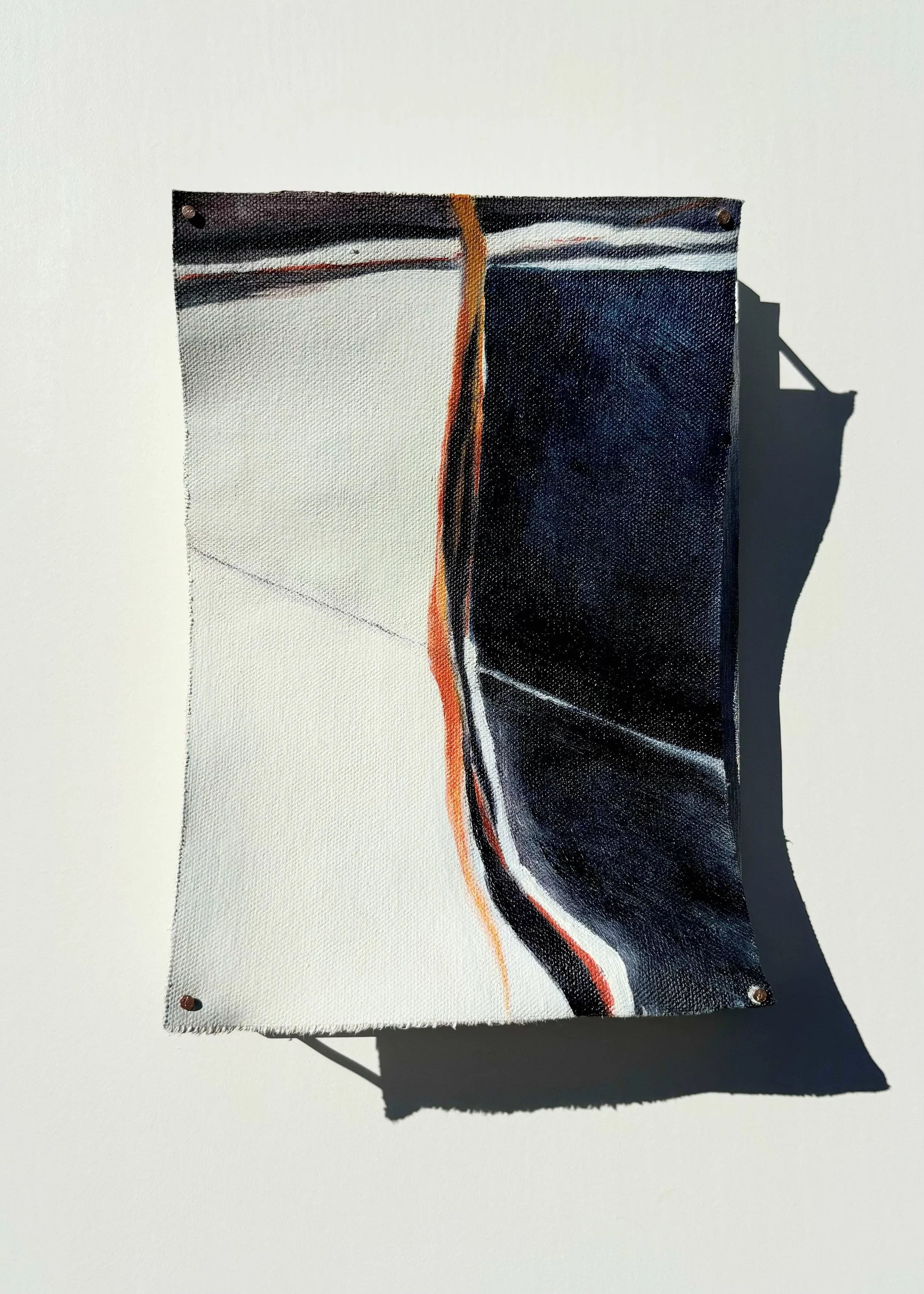 I use oil paint and printmaking techniques to develop dimensional, interlacing landscapes and charts. They reach out into space–using multiple surfaces to capture a path across the planet.